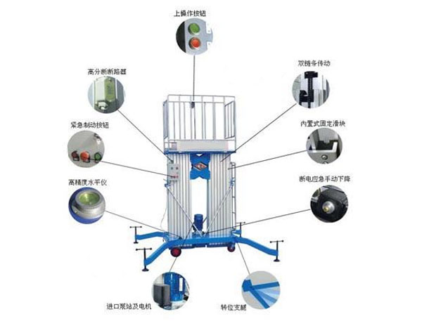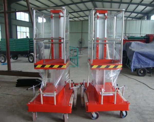 双柱铝合金升降机:升降动力分为220V、 380V,或电瓶动力源,特殊环境也可采用防爆泵站及防爆电器。升高4——10米,载重100-150公斤。主体采用高强度优质铝合金材料,具有造型美观、体积小、重量轻、升降平稳、安全可靠等优点。广泛用于工厂、宾馆、餐厅、车站、影剧院、展览馆等场所,是保养机具、油漆装修、调换灯具、电器、清洁保养等用途的最佳安全伴侣。